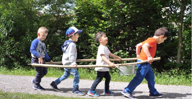 Nach einem anstrengenden Morgen draussen geht es zurück zum Startpunkt. Während die einen sich an den Händen haltend mit der Erzieherin auf den Weg machen, tollen ein paar Knaben noch wild herum. Sie werden vom Psychomotoriktherapeuten gefragt, ob sie stark genug wären, die Stecken für die weitere Verwendung transportieren zu können.
